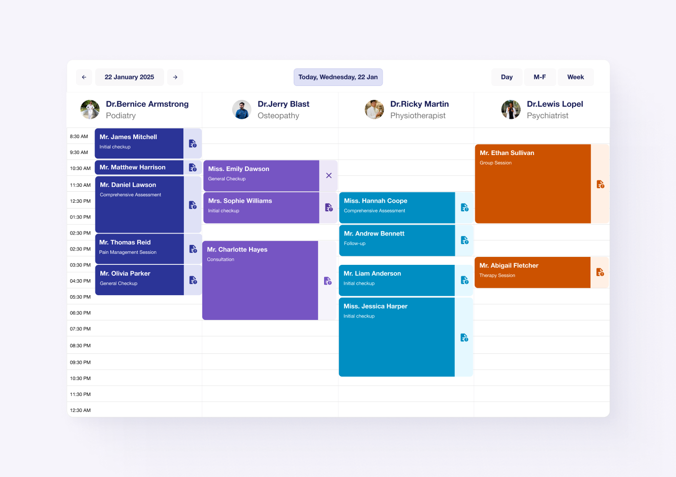 Generate advanced reports for patients, practitioners, appointments, and locations to track performance and efficiency.